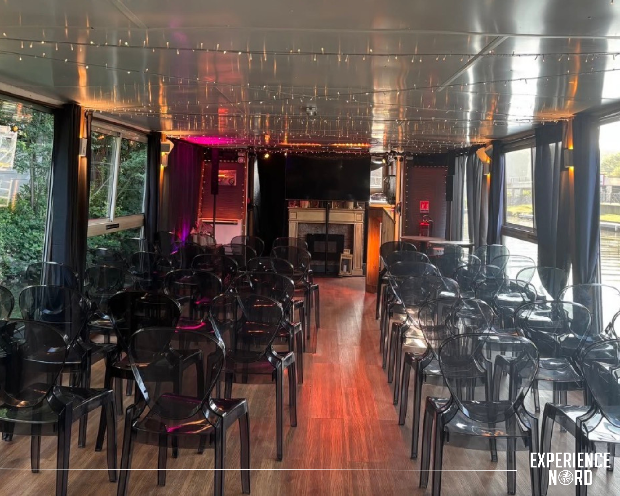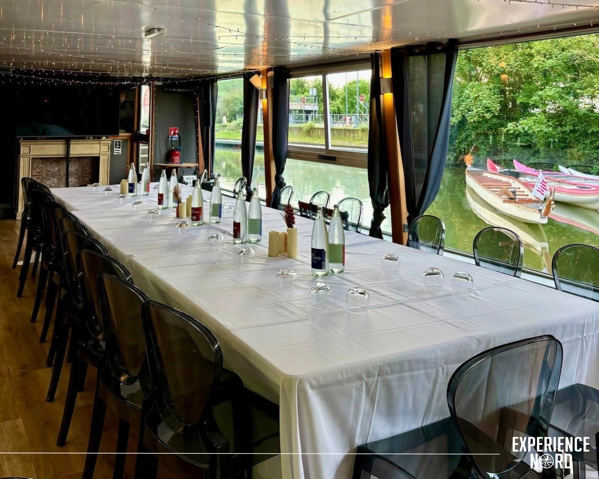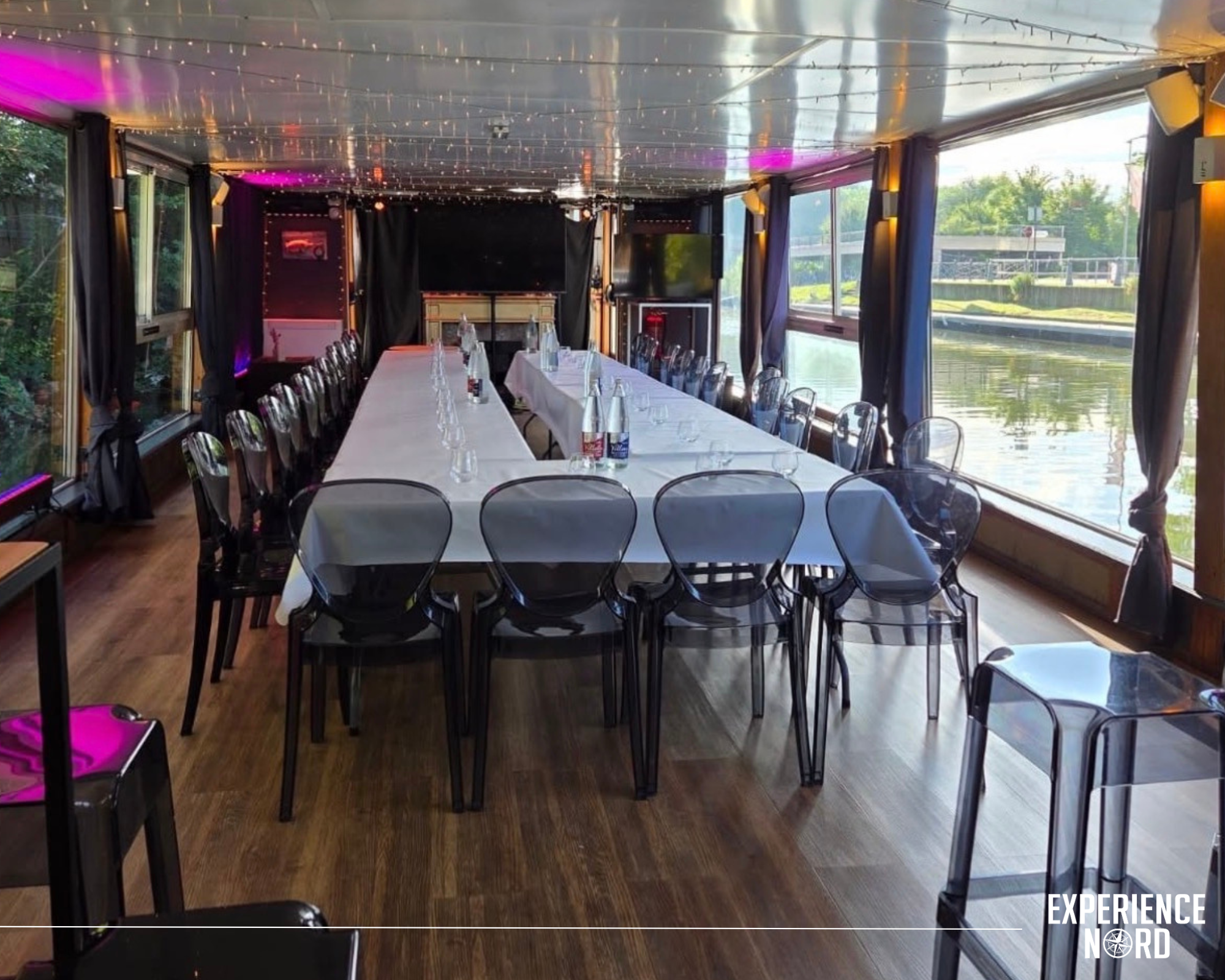 L’intérieur est composé d’un bar et d’une grande salle modulable de 38 mètres de long entièrement vitrée. L’ensemble est équipé en son, lumières et mobilier et peut accueillir jusqu’à 60 personnes assises ou 100 personnes debout. Cette salle panoramique vous permet de penser votre événement sur mesure : séminaire, réunion, afterwork, ou encore inauguration… Surprenez vos invités grâce à ce lieu unique proche de Lille. Le petit plus ? Sa terrasse faisant toute la surface du bateau, qui vous offre une vue exceptionnelle sur les bords de la Deûle.