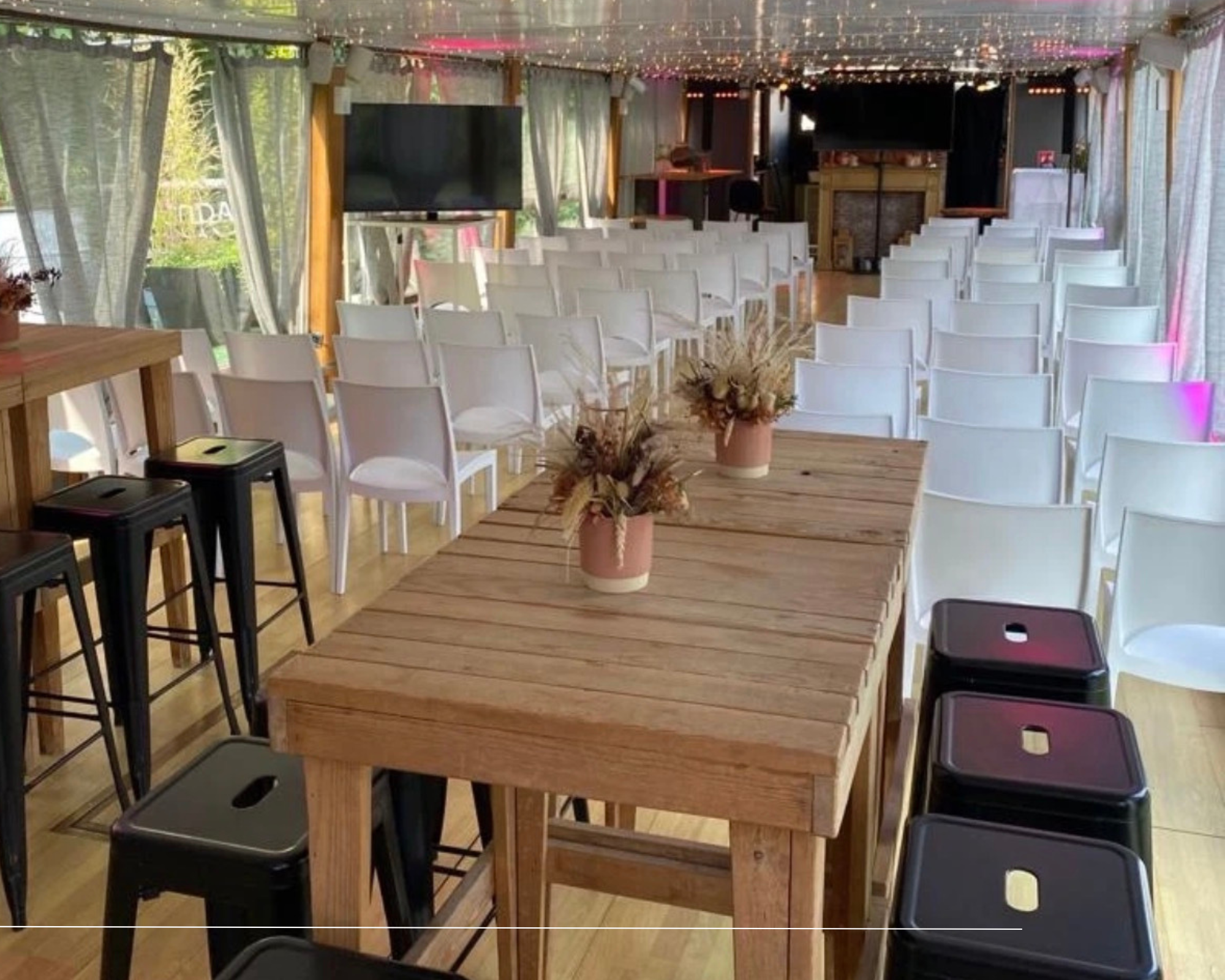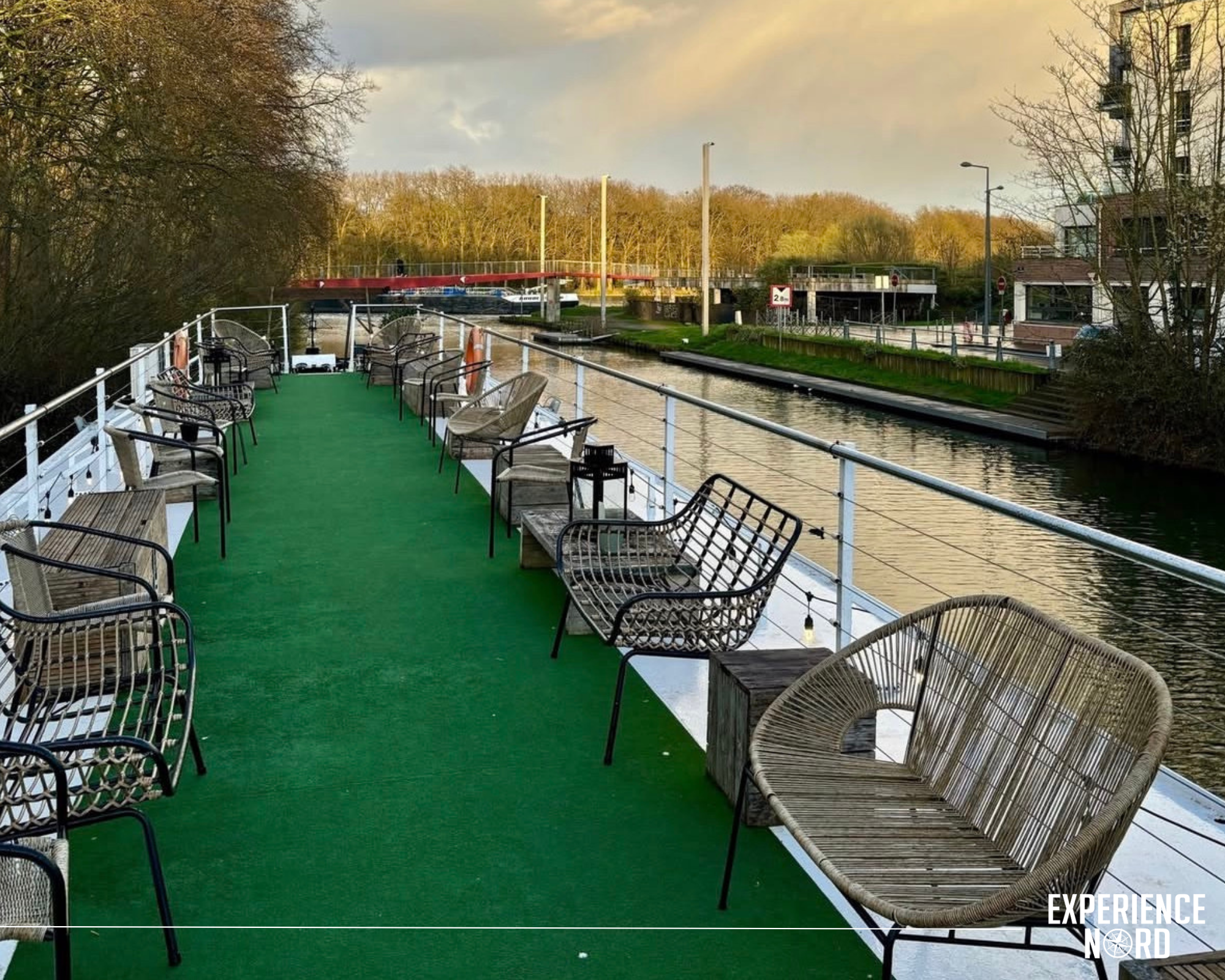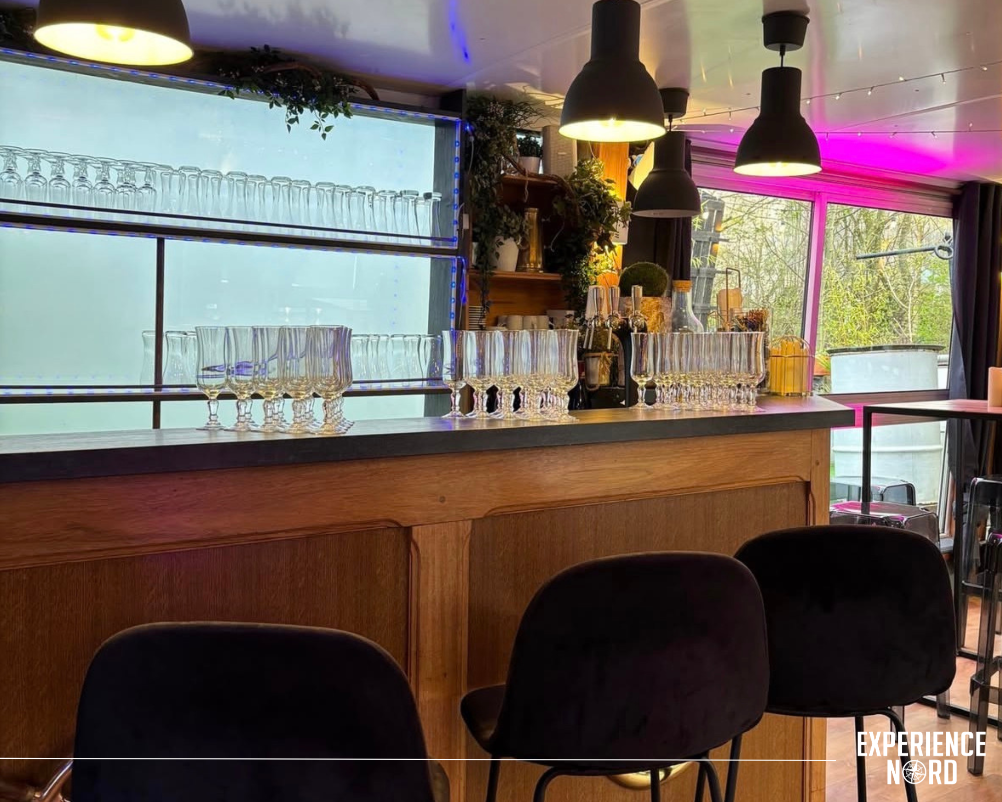 L’intérieur est composé d’un bar et d’une grande salle modulable de 38 mètres de long entièrement vitrée. L’ensemble est équipé en son, lumières et mobilier et peut accueillir jusqu’à 60 personnes assises ou 100 personnes debout. Cette salle panoramique vous permet de penser votre événement sur mesure : séminaire, réunion, afterwork, ou encore inauguration… Surprenez vos invités grâce à ce lieu unique proche de Lille. Le petit plus ? Sa terrasse faisant toute la surface du bateau, qui vous offre une vue exceptionnelle sur les bords de la Deûle.